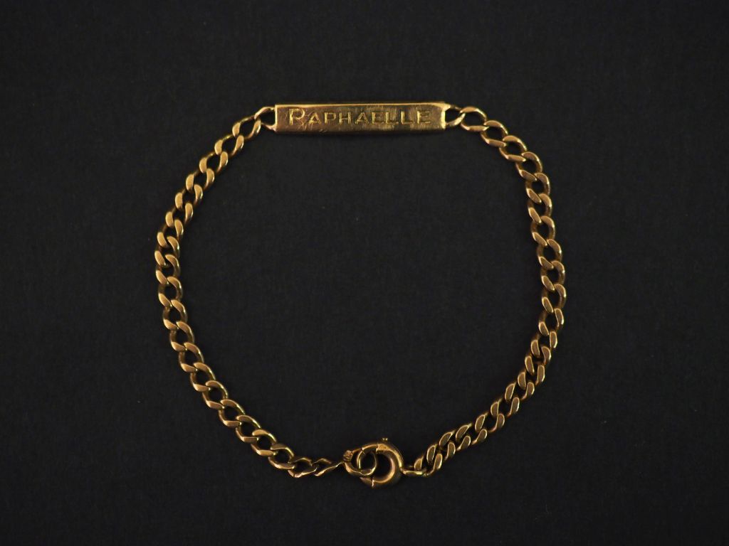 Bracelet de naissance en or jaune 750, marquée "Raphaëlle". Long. 15 cm Poids. 3,53 g