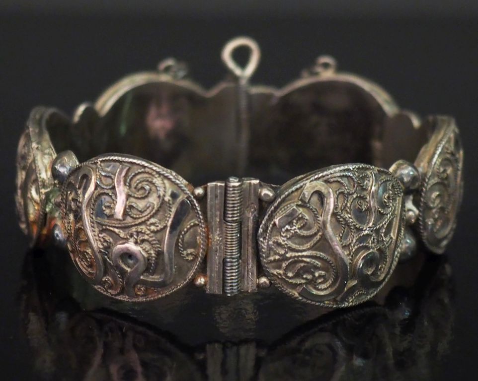 Bracelet de style Afrique du Nord en argent, à décor filigrané. Poids. 44,33 g (petites restaurations)