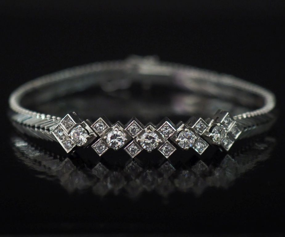 Bracelet de style Art déco en or blanc, à décor d'un motif géométrique en son centre serti de petits diamants, cinq d'entre eux pesant 0,16 ct environ. Long. 18,5 cm Poids tel. 25,16 g (trois petits manques au niveau du bracelet)