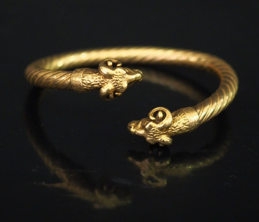 Bracelet en or, à décor de côtes torses terminée par deux têtes de béliers ciselées. Diam. 6 cm environ Poids : 41,70 g (à charge de contrôle)