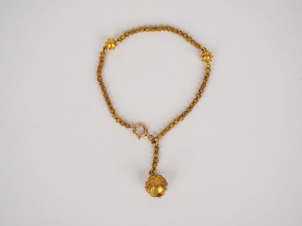 Bracelet en or jaune, à décor d’une pendeloque en forme de boule. Poids. 12.19 g