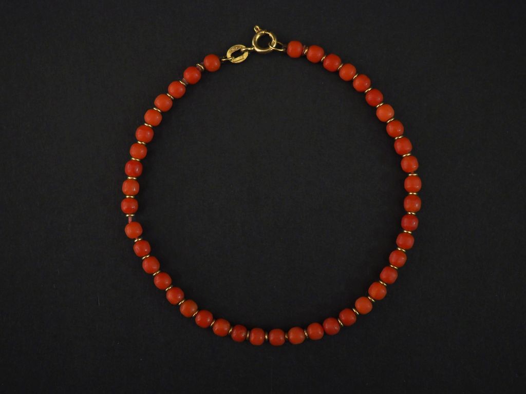 Bracelet en or jaune, orné de perles de corail. Long. 20 cm Poids tel. 4,84 g (petit manque, fil légèrement distendu à un endroit)