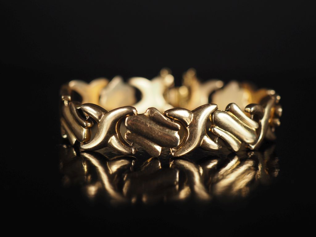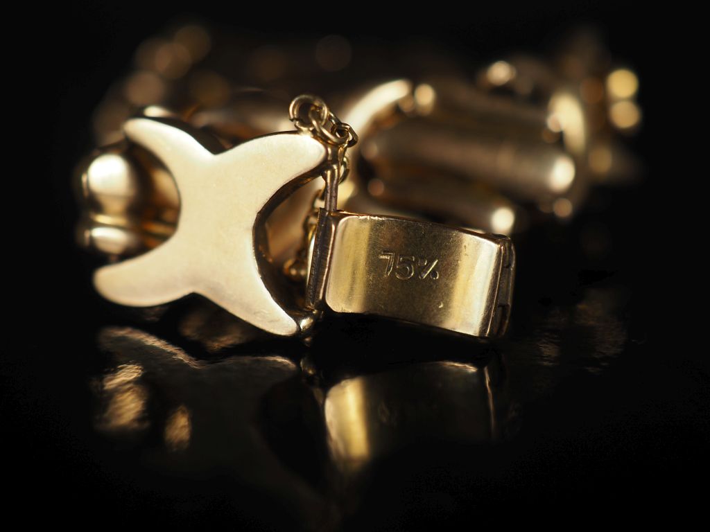 Bracelet gourmette en or 750, maillons articulés en forme de godrons et de croix (chainette de sécurité) Poids : 28 g