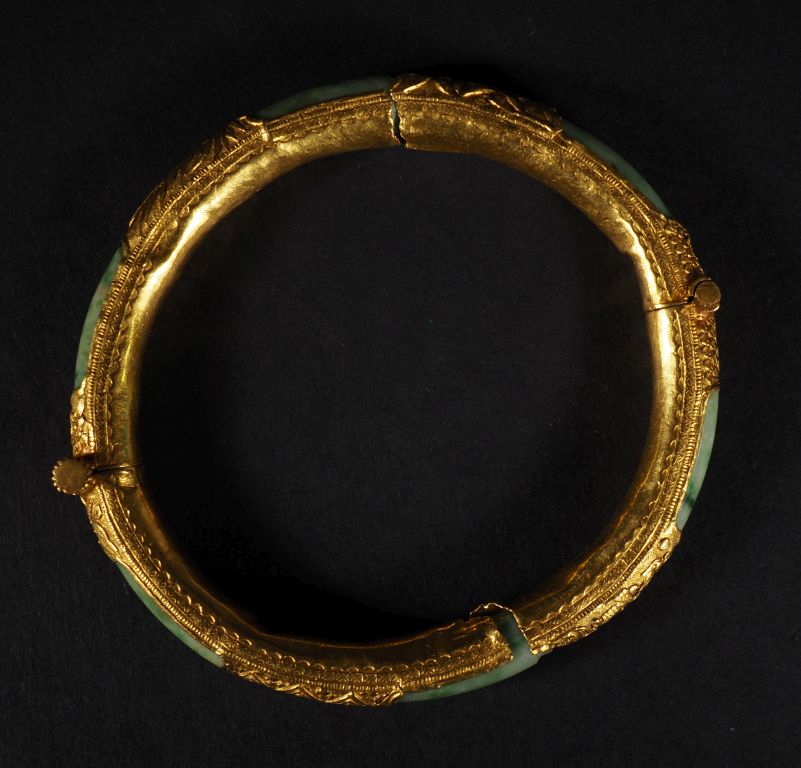 Bracelet indochinois en or 750 et jadéite Poids tel : 35,20 g (cassé)