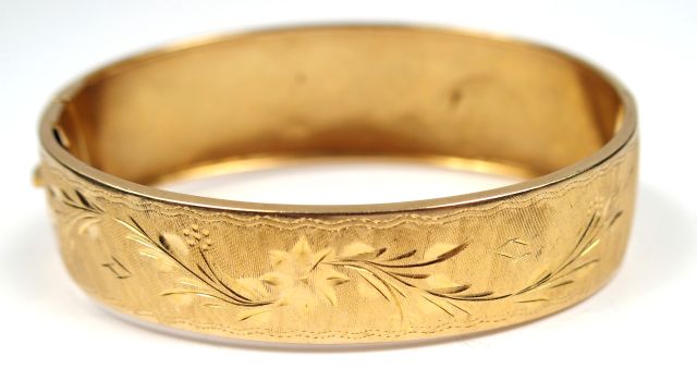 Bracelet jonc Napoléon III en or, à décor gravé de fleurs. Poids : 28,47 gr