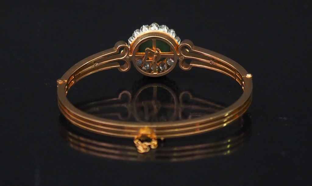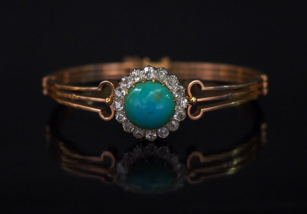 Bracelet jonc Napoléon III en or jaune, à décor en son centre d'un motif de fleur sertie d'un turquoise en cabochon entouré d'une couronne de seize diamant taille ancienne. Bracelet ajouré. Chainette de sécurité. Diam. du motif central : 2 cm Dim. intérieure du bracelet : 4,5 x 5,5 cm Poids tel. 28,24 g