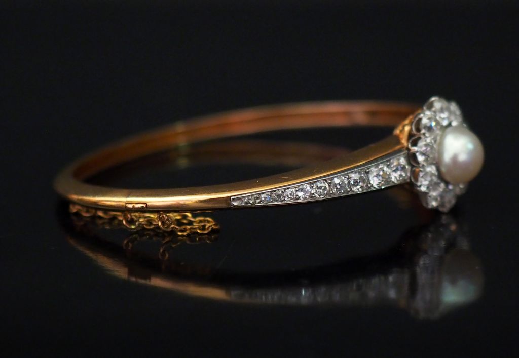 Bracelet jonc Napoléon III en or jaune, à décor en son centre d'une maguerite sertie d'une perle blanche en cabochon entourée de dix diamants tailles ancienne. Motif central épaulé de chaque côté de dix diamants disposés en chute. Chainette de sécurité. Dim. du motif central : 1,5 x 1,5 cm 4,8 x 5 cm Poids tel. 22,87 g
