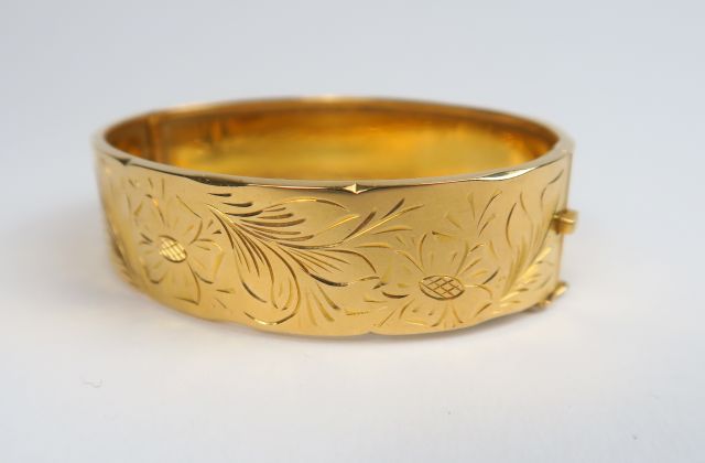 Bracelet manchette en or, à décor gravé de fleurs et de feuillage. Poids : 28,39 g