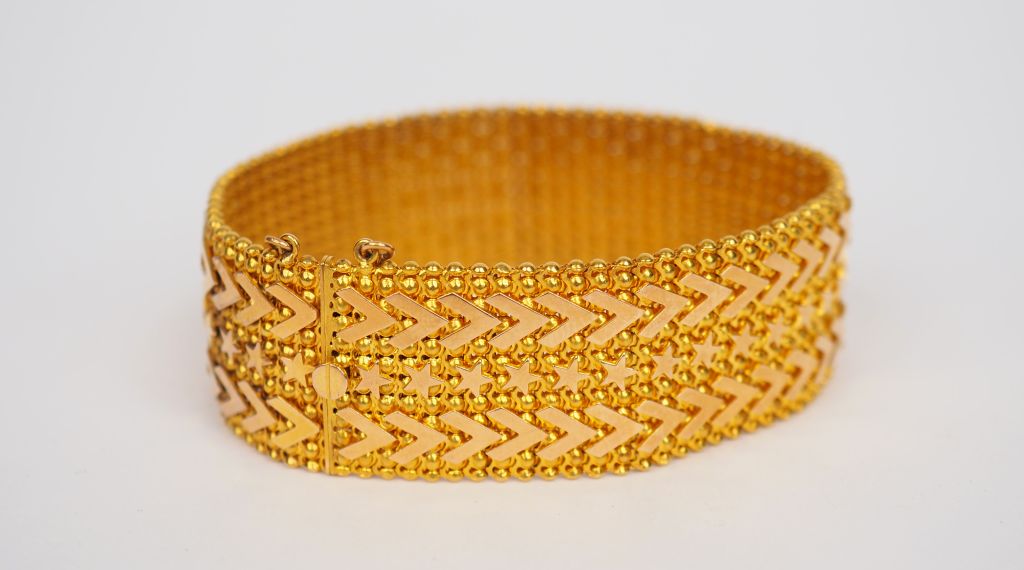 Bracelet manchette en or jaune, maille plate à décor d’étoiles et de motifs géométriques. Poids. 29.25 g