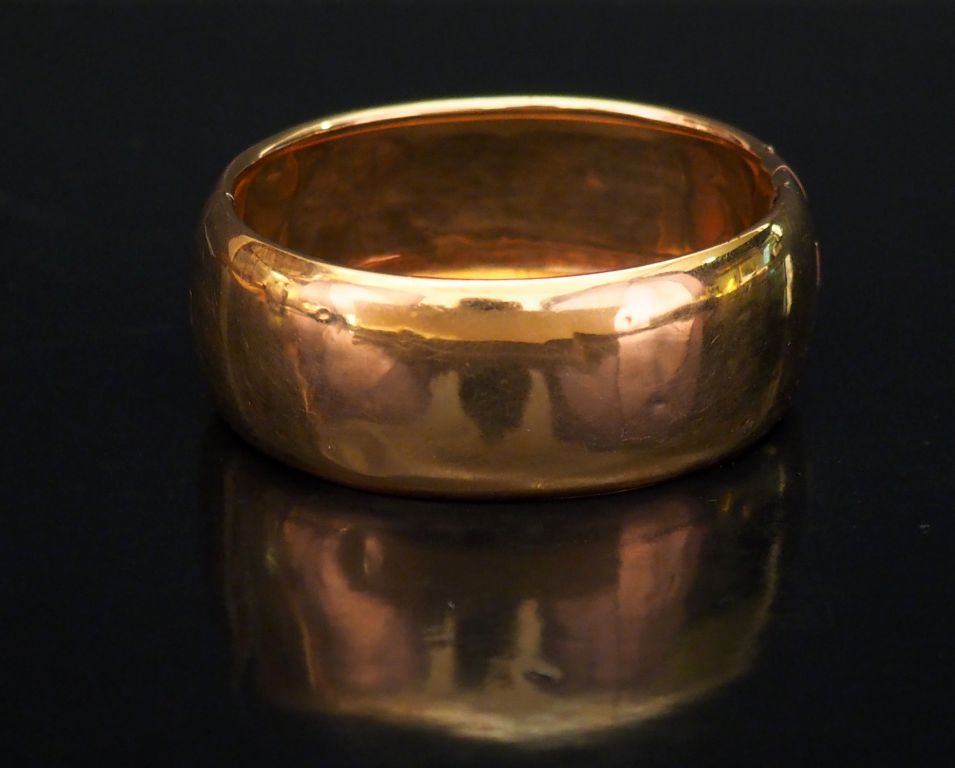 Bracelet manchette Napoléon III rigide en or jaune. Larg. 2,7 cm Poids. 35,04 g (petits enfoncements, manque la chainette de sécurité)