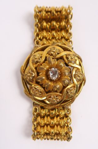 Bracelet Napoléon III en or ajouré à décor de motifs floraux, orné en son centre d'un diamant taillé en rose. Poids tel : 22 g