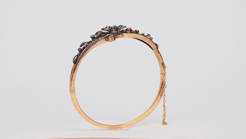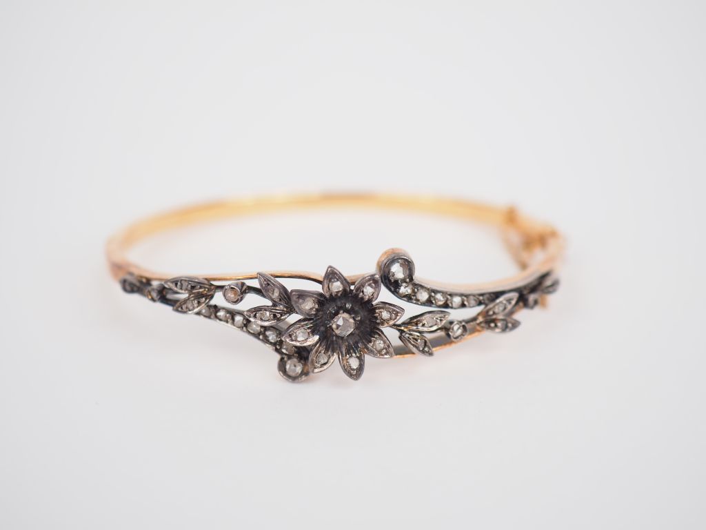 Bracelet Napoléon III en or jaune et diamants taillés en rose, à décor d'une fleur et de feuillage. Poids tel. 13,27 g