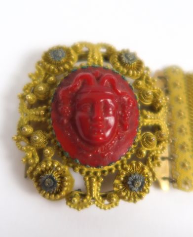 Bracelet Napoléon III en pomponne, médaille ajourée orné d’un camée figurant une tête de personnage à l’antique .On y joint une paire de boucles d’oreilles ornées de perles de jais, monture en or, et un bracelet jonc en vermeil, jaspe sanguin serti d’un motif en étoile rehaussé d’une pierre rouge en médaillon. Poids tel du bracelet en vermeil : 7.2 g
