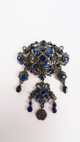 Broche à pendeloques 1900 en métal émail polychrome et pierres bleues