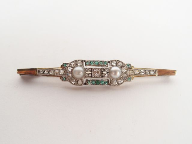 Broche Art déco monture or blanc, pavage de diamants taille rose et taille ancienne, d'émeraudes et rehaussée de 2 perles. 6,5cm Poids tel: 5,7gr