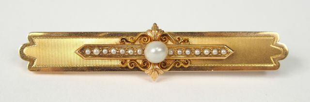 Broche barette Napoléon III en or jaune, motif central incrusté de perles. 72 x 10mm Poids tel: 9,7gr
