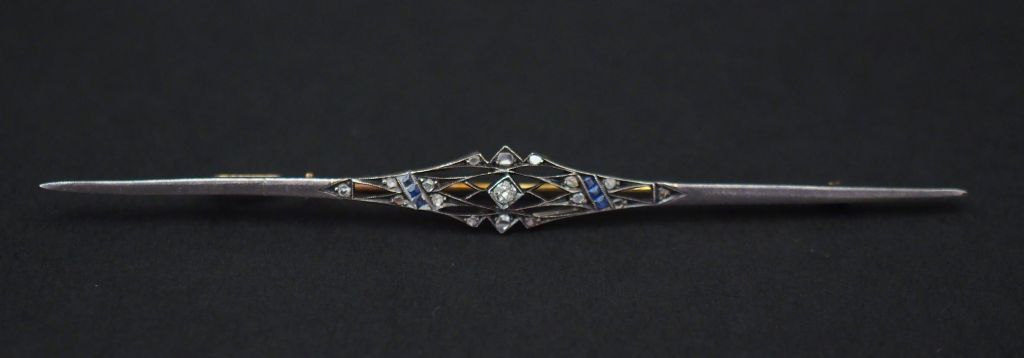 Broche barrette ajourée en or jaune et argent, sertie de pierres bleues calibrées et petits éclats de diamant. Long. 9 cm Poids tel. 3,94 g