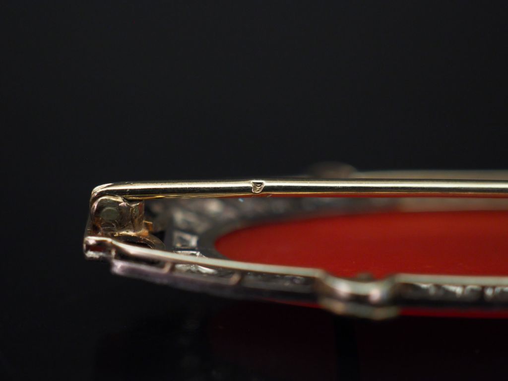 Broche barrette Art déco en or blanc, corail, émail noir et petits diamants, à décor de fleurs. Poinçonnée S.A.S ? (poinçon légèrement effacé) Long. 5,5 cm Poids tel. 8,60 g (très légers sauts d'émail)