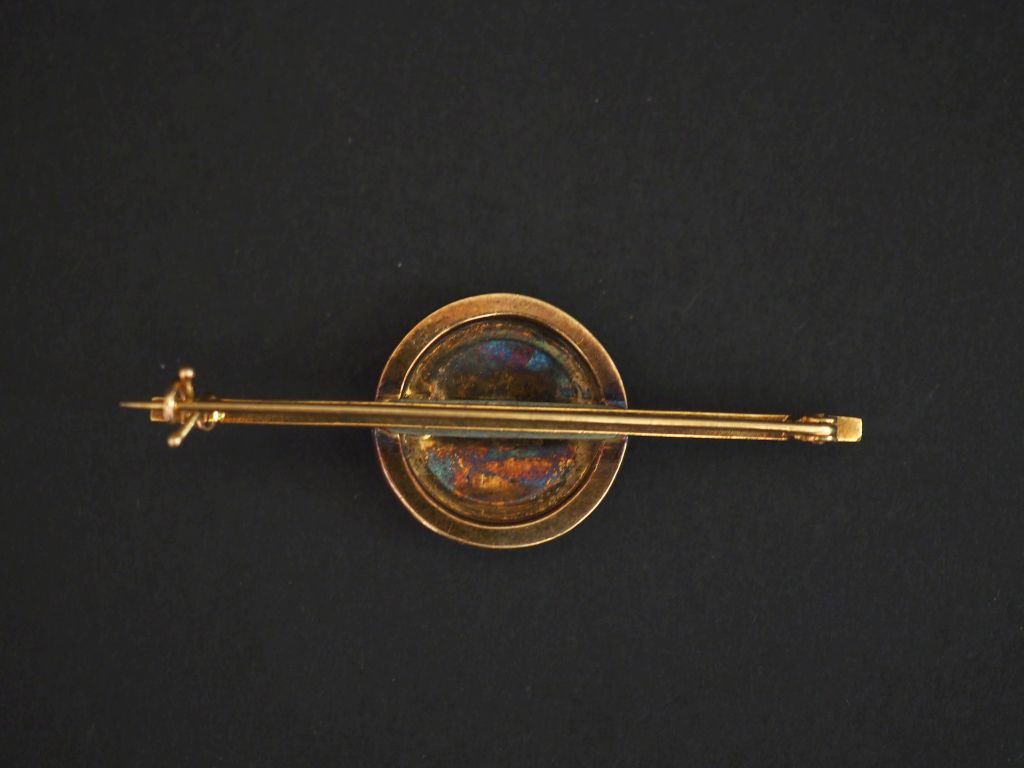 Broche barrette en or jaune 750, à décor en son centre d'un médaillon serti de petites perles blanches et éclats de diamants. Long. 5,5 Diam. du médaillon central : 2 cm Poids tel. 8,68 g