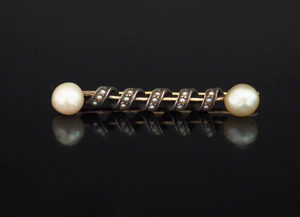 Broche barrette en or jaune 750 et argent 925, à décor d'enroulement et sertie de perles. Long. 4,4 cm Poids tel. 3,88 g