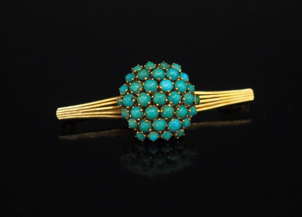 Broche de forme barrette, à décor en son centre d'un dôme serti de petits turquoises en cabochon. Long. 5,7 cm Poids tel. 14,50 g