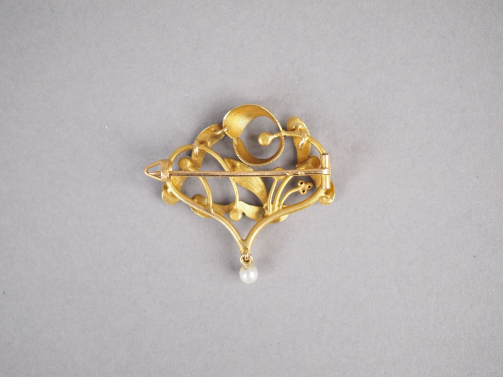 Broche de style Art Nouveau en or jaune et perles, à décor ajouré de gui. Dim. 3 x 3 cm Poids tel. 3,72 g