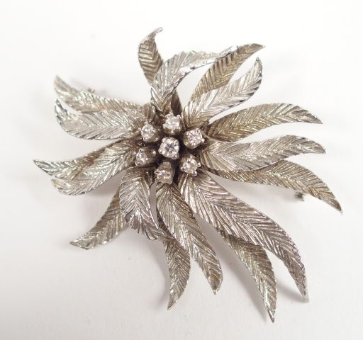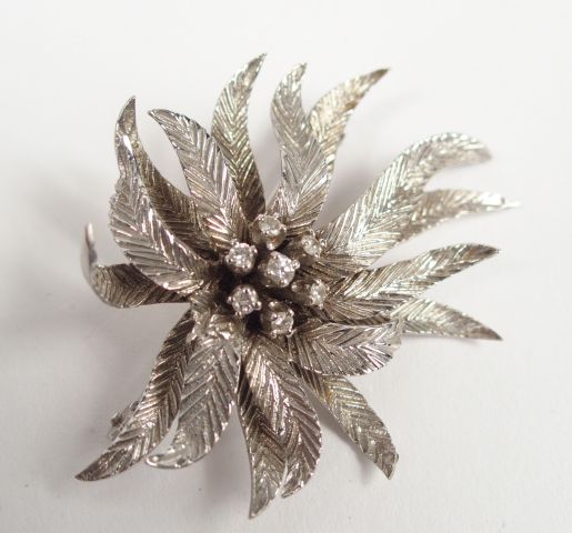 Broche en or blanc en forme de fleur épanouie, rehaussée en son centre de 7 diamants taille moderne de 0,02ct à 0,04ct environ. 5cm Poids tel: 10,4gr