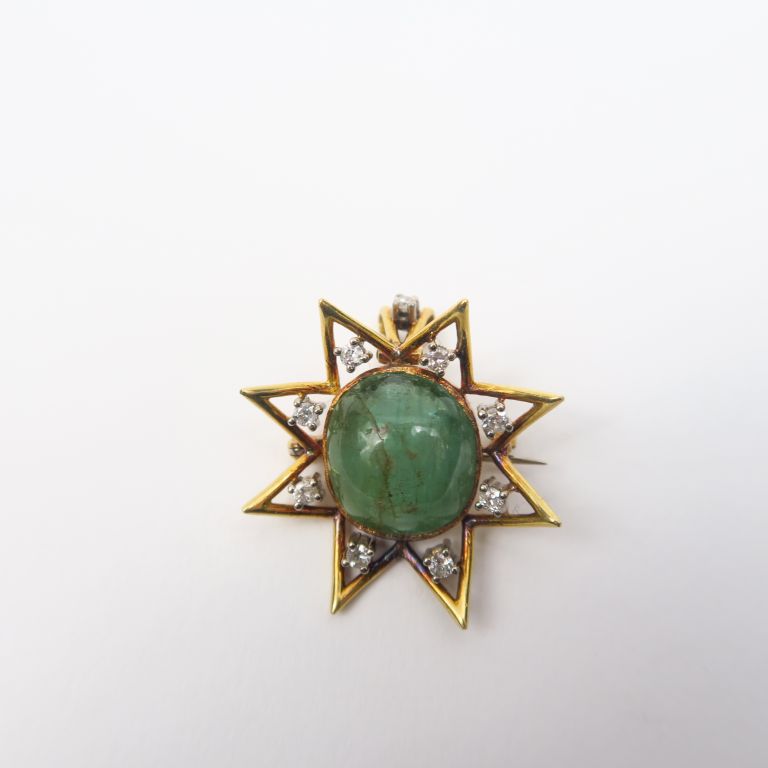 Broche en or en forme d'étoile ornée de huit diamants entourant une émeraude en cabochon. Poids. 9,70 g