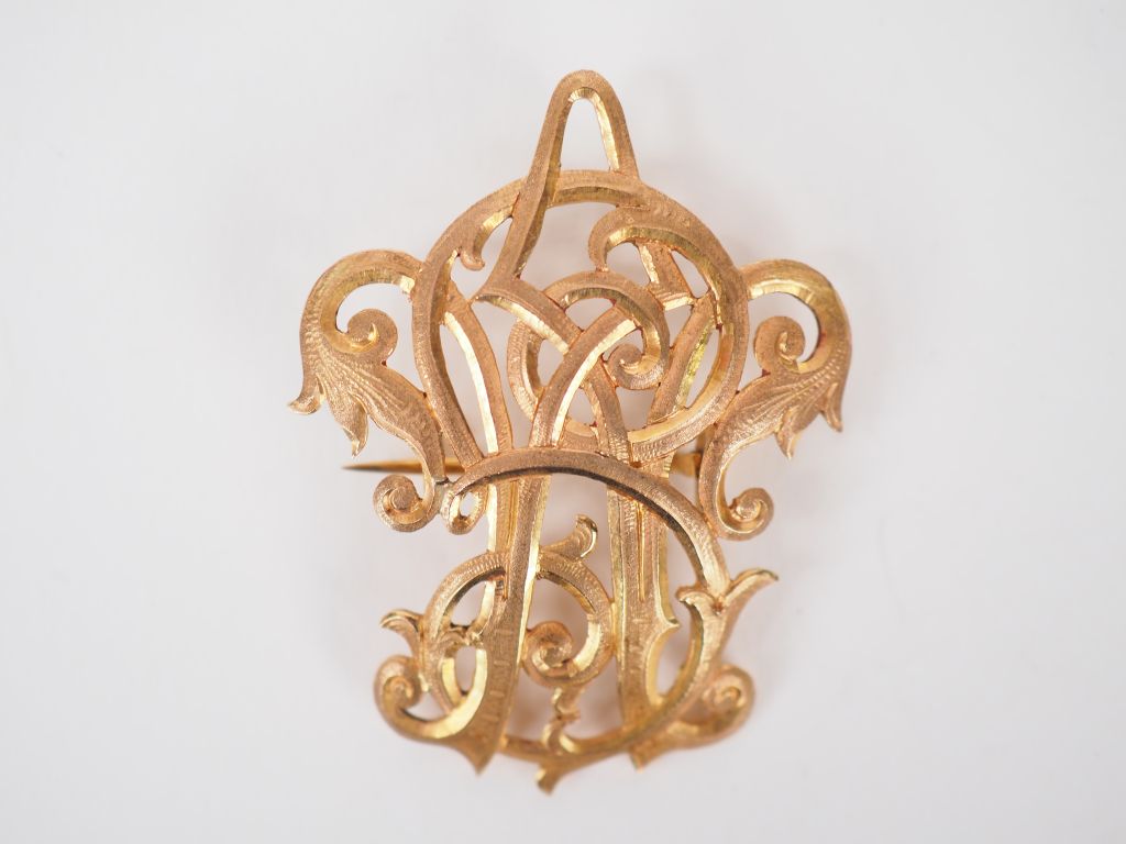 Broche en or jaune, à décor de monogramme. 4,5 x 3,5 cm Poids. 9.77 g