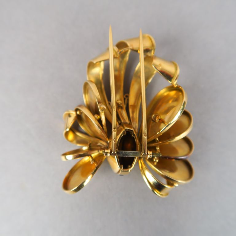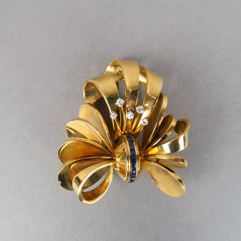 Broche en or jaune, diamants et saphirs calibrés, en forme de feuille stylisée. Poids tel. 33,72 g