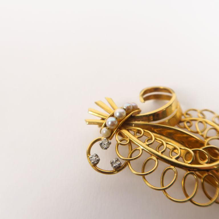 Broche en or jaune en forme de fleur ornée de cinq perles et de trois petits brillants. Poids tel. 10 g