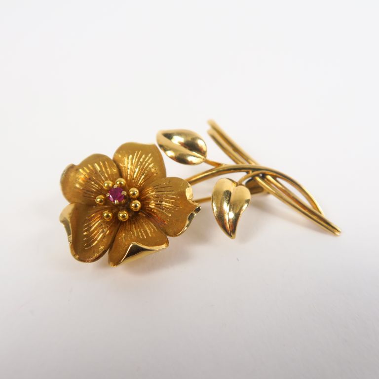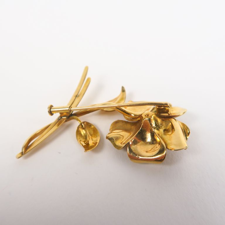 Broche en or jaune en forme de fleur. Poids tel. 9,30 g (très léger enfoncement à un pétale)