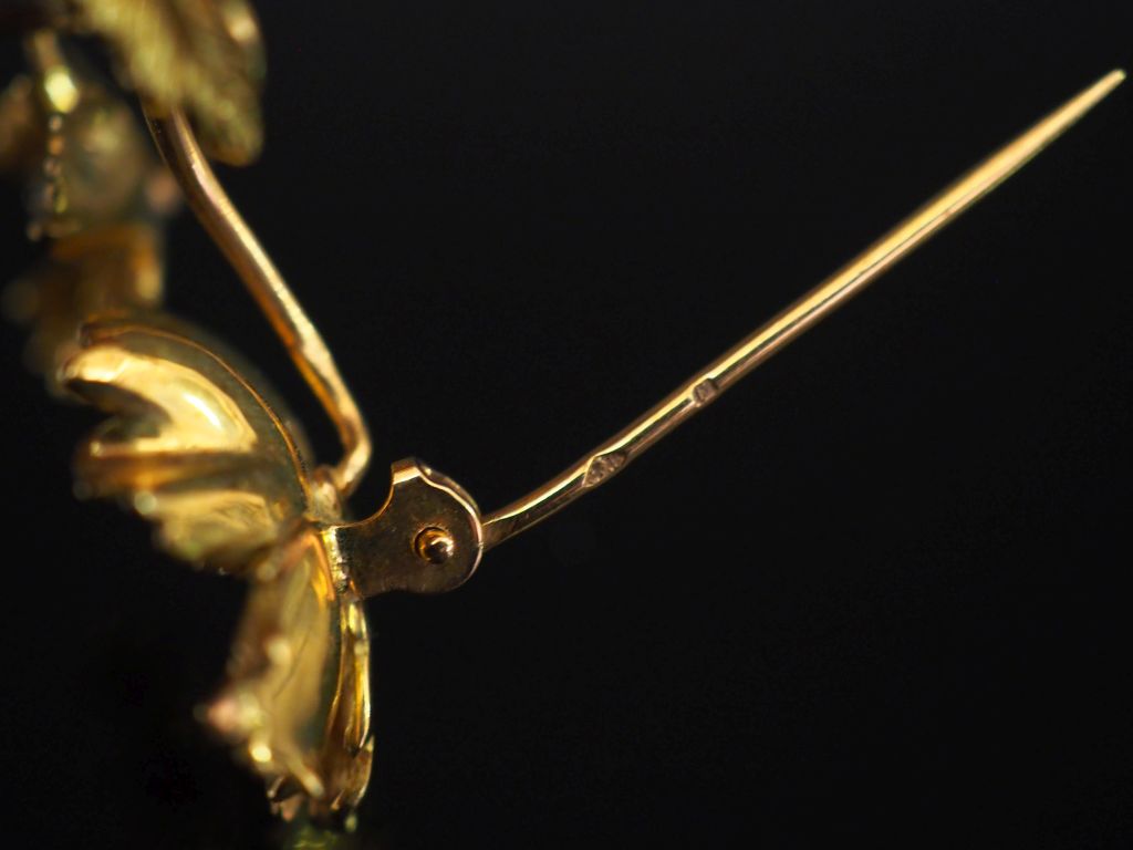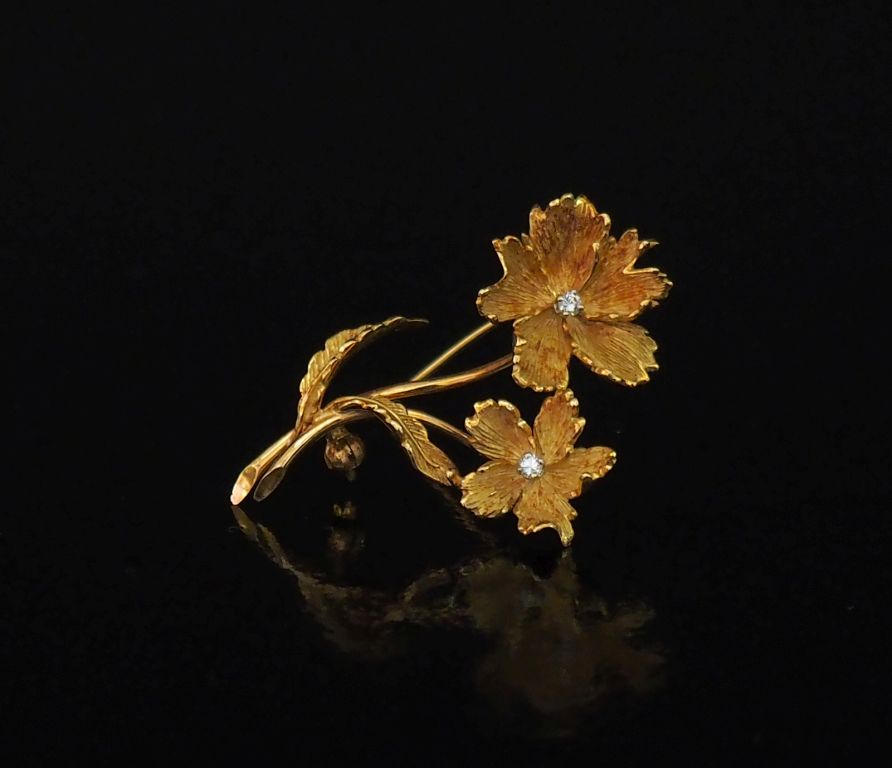 Broche en or jaune, en forme de fleurs, serties en leurs centres d'un petit diamant. H. 4,5 cm Poids tel. 7,88 g