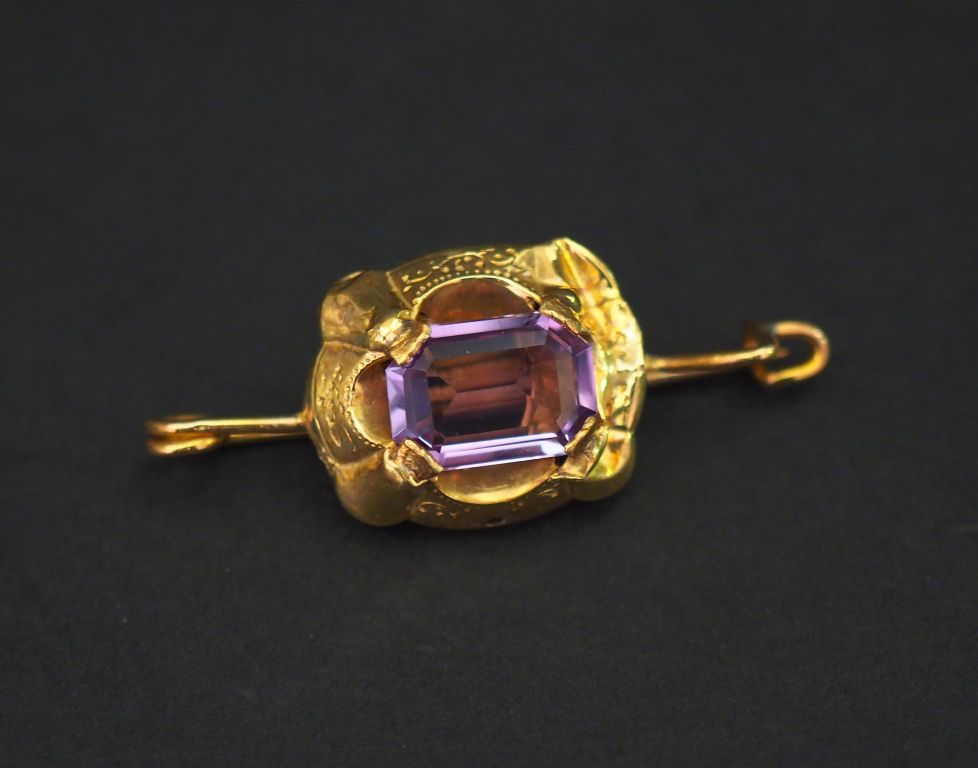 Broche en or jaune, sertie en son centre d’une améthyste. Poids tel. 4,67 g (enfoncement)