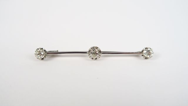 Broche en platine, ornée de 3 diamants taille ancienne entre 0,50 et 0,40 cts environ.