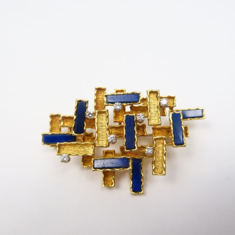 Broche moderniste à décor de motifs géométriques en or, lapis lazuli et sept diamants. Poids tel. 18,30 g