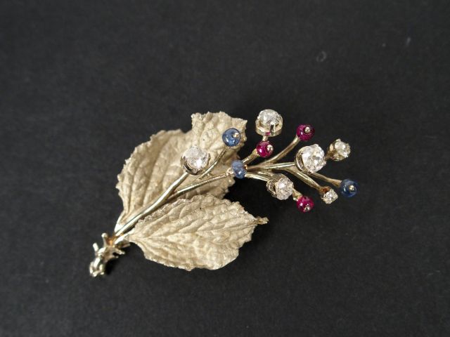 Broche monture or blanc en forme de branche fleurie rehaussée de diamants taille ancienne, de saphirs et de rubis taille cabochon. 5,5cm Poids tel: 11,3gr