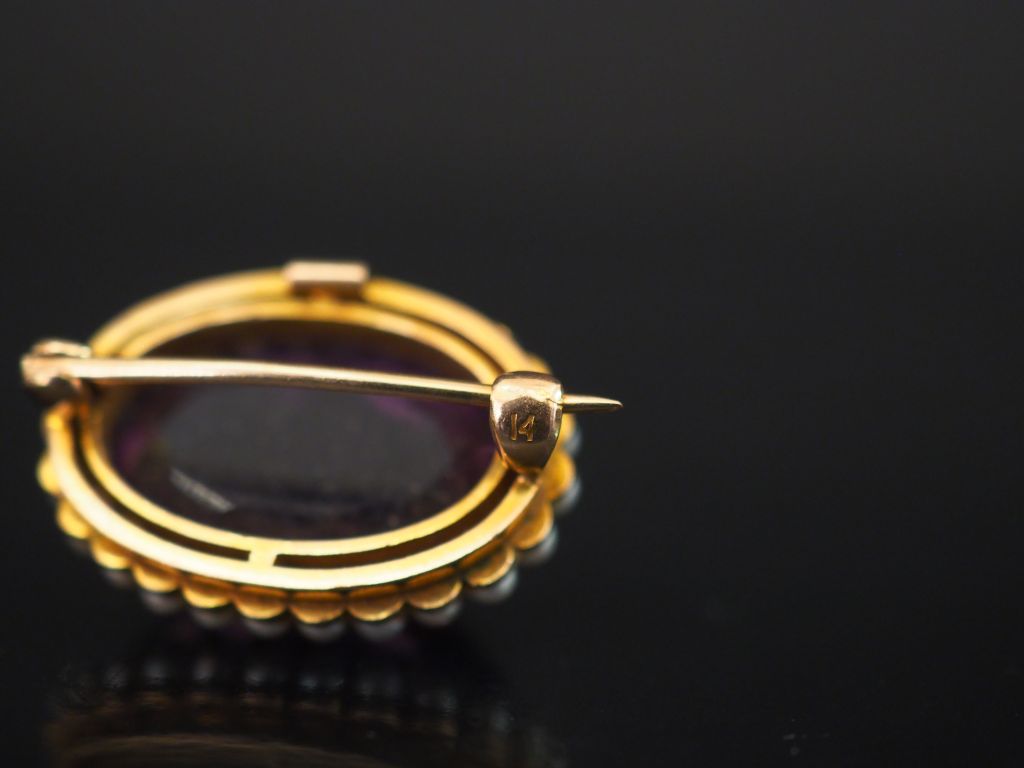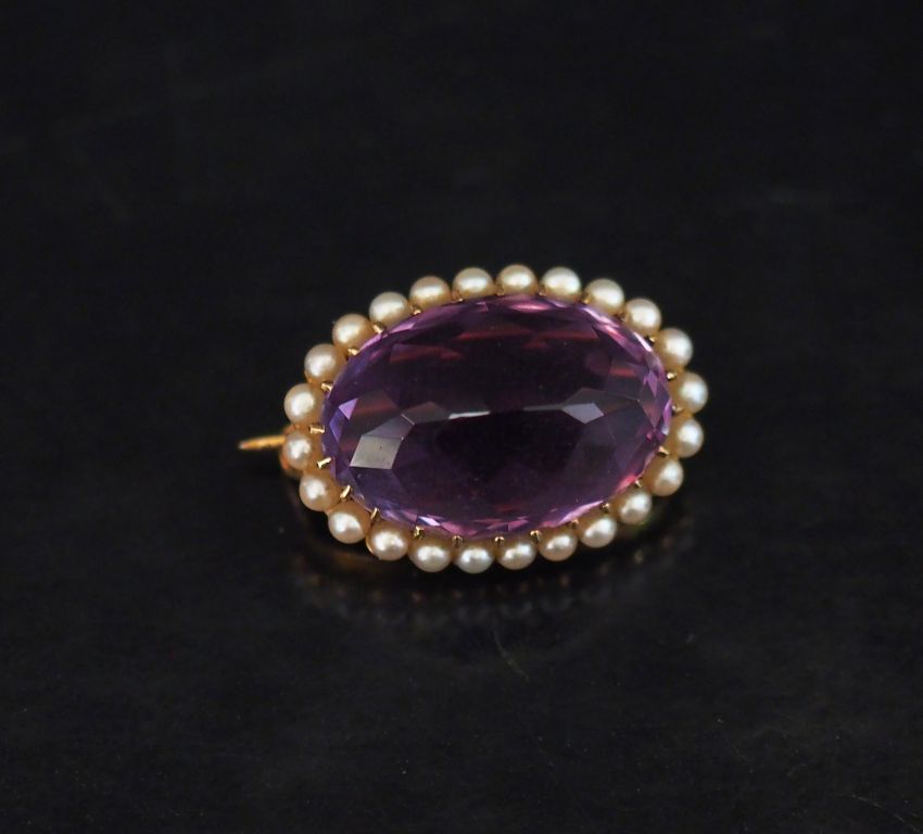 Broche Napoléon III de forme ovale en or jaune, sertie en son centre d'une pierre mauve entourée d'une couronne de petites perles blanches. 2,3 x 1,6 cm Poids tel. 6,33 g