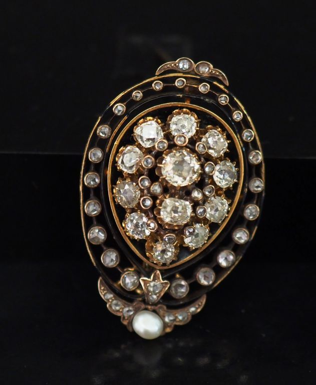 Broche Napoléon III en forme de goutte, orné d'une perle et de douze diamants de taille ancienne, belle monture ajourée en or. 4 x 2,8 cm Poids tel : 13,89 g
