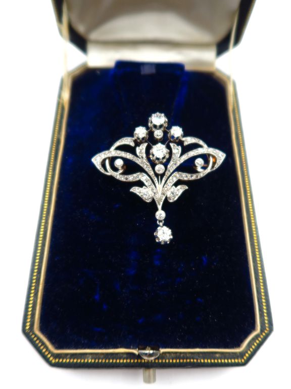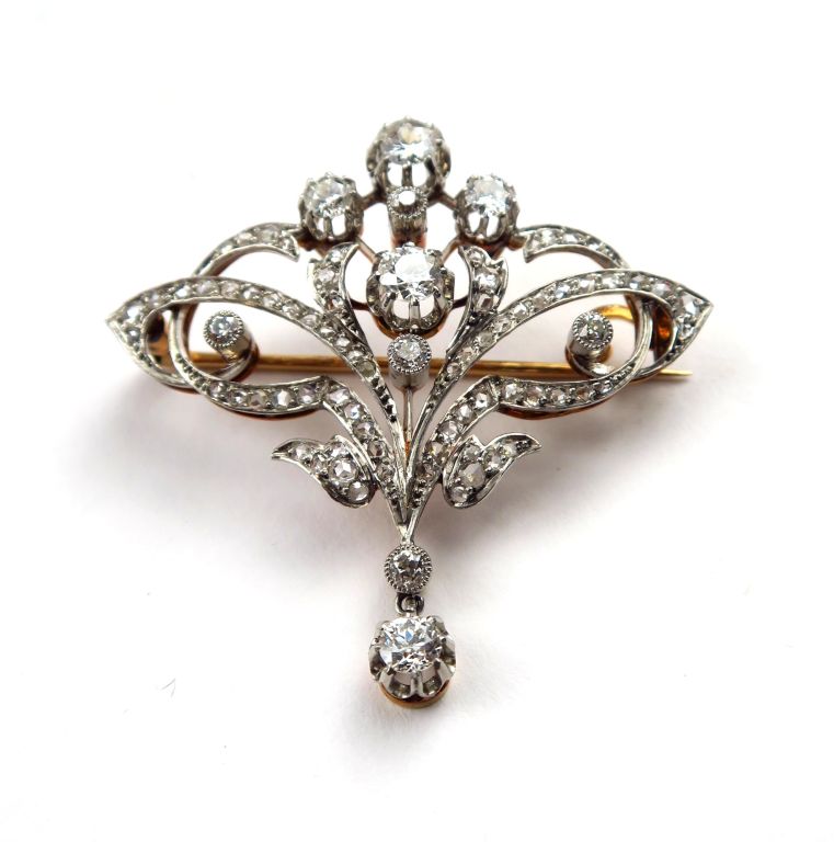 Broche Napoléon III en or jaune et or blanc, à décor de rinceaux feuillagés ornés de quatre diamants principaux (0,35 à 0,20 carat environ) et d'un diamant de 0,25 carat en pendeloque. Pavage de roses. Poids tel : 13,2 g. Dans son écrin