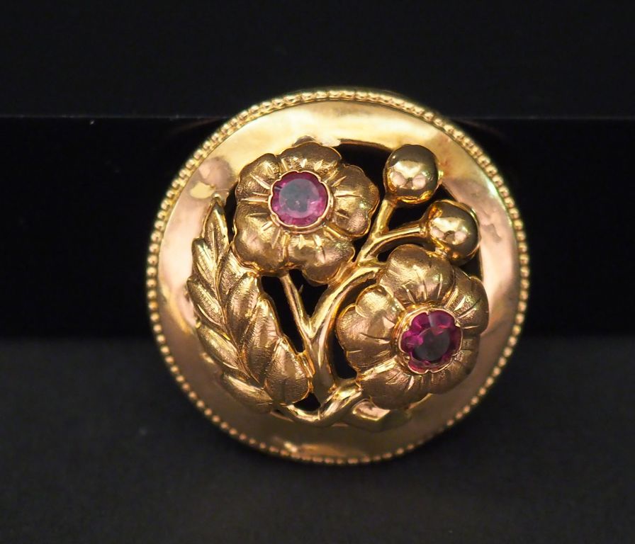 Broche ronde Napoléon III en or jaune, à décor de fleurs serties de pierres roses. Diam. 2,5 cm Poids tel. 3,40 g (très légers enfoncements)