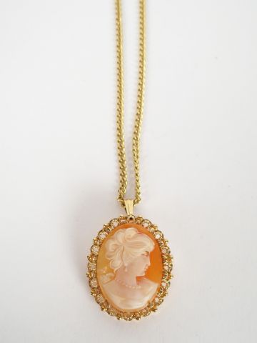 Camée coquille monté en pendentif entourage or, chaîne métal doré.