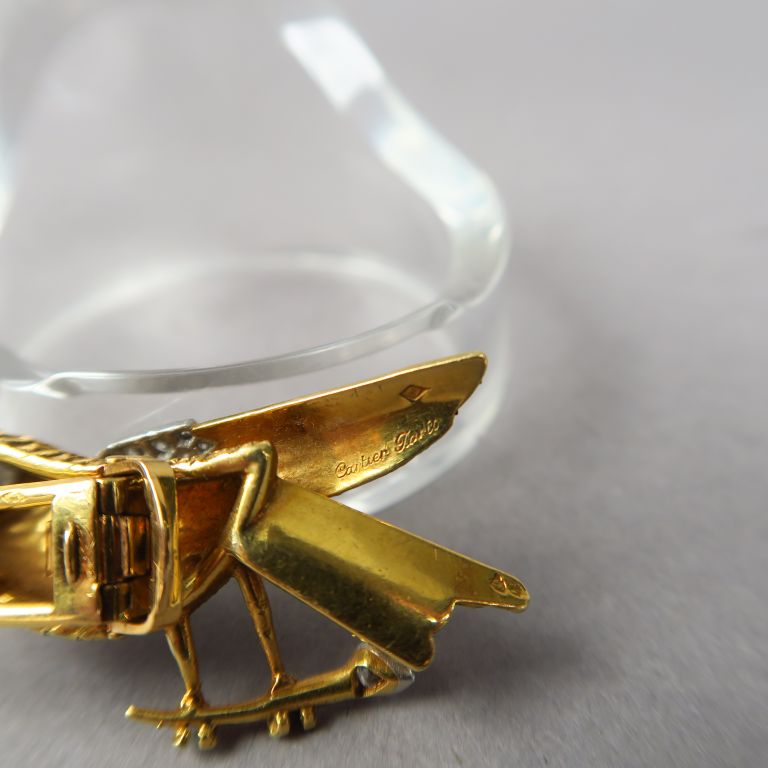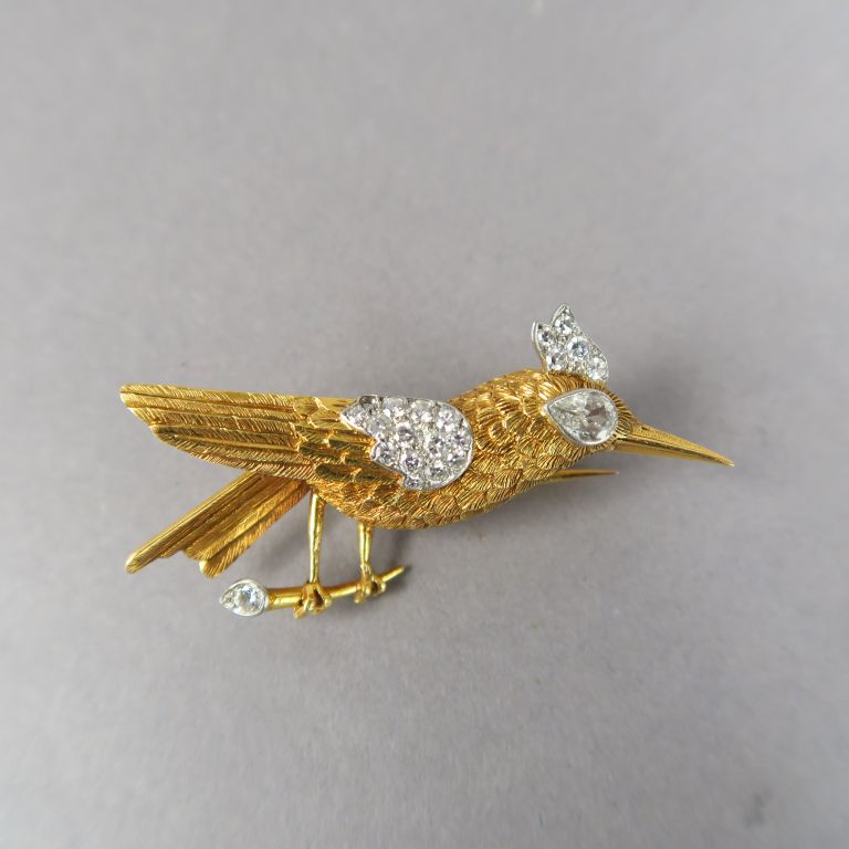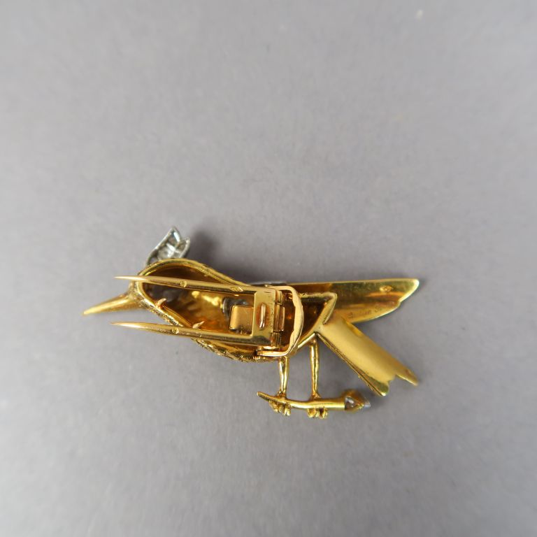 CARTIER. Broche en or jaune et diamants en forme d'oiseau. Signée et numérotée 014389. Long. 5 cm Poids tel. 12,94 g (manque un petit brillant)