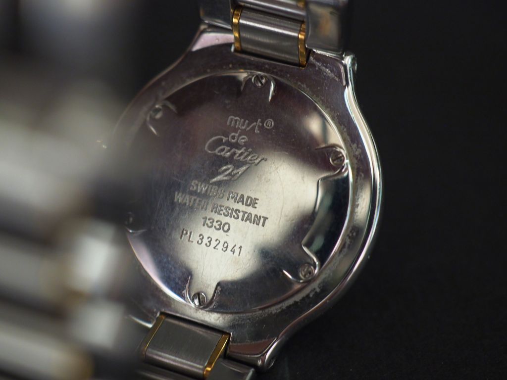 CARTIER, Must 21 Montre bracelet de dame en acier et métal doré. Cadran rond à chiffres romains pour les heures et arabes pour les minutes. Le remontoir serti d'une pierre bleue en cabochon. Bracelet articulé en acier et métal doré à boucle déployante. Signée sur le cadran, au revers et sur le bracelet. Référence : 1330 / PL332941. Diam. 32 mm Dans sa boite.