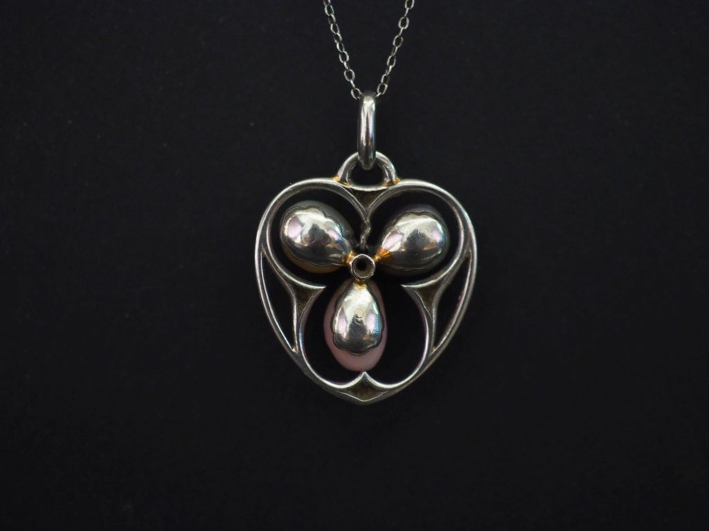 Chaine en or blanc 750, maille forçat, et son pendentif en or blanc 750 en forme de cœur agrémenté de deux perles et d'une pierre rose en forme de goutte en pendeloques. La monture du pendentif agrémentée de petites éclats de diamants. 2,1 x 2,1 cm Long. 50 cm Poids tel. 6,90 g