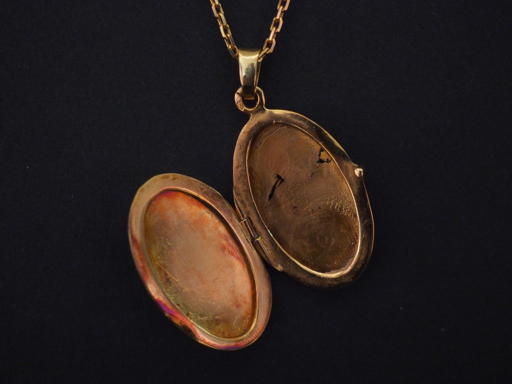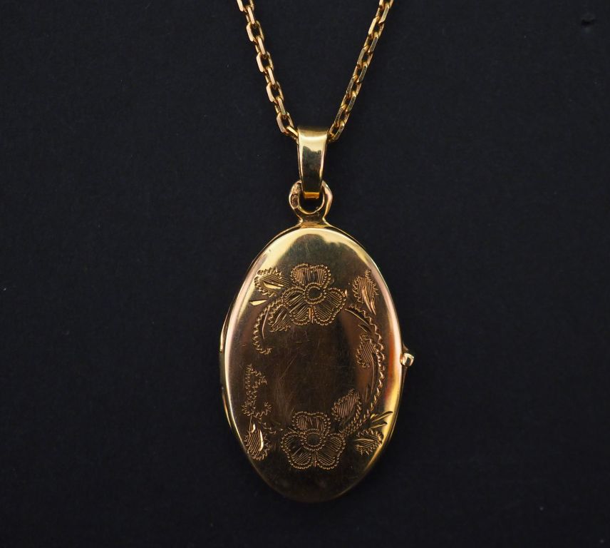 Chaine en or jaune, maille forçat, et pendentif porte-photo en or jaune, à décor gravé de fleurs. Dim. du pendentif : 2,6 x 1,8 cm Long. 50 cm Poids. 9,65 g