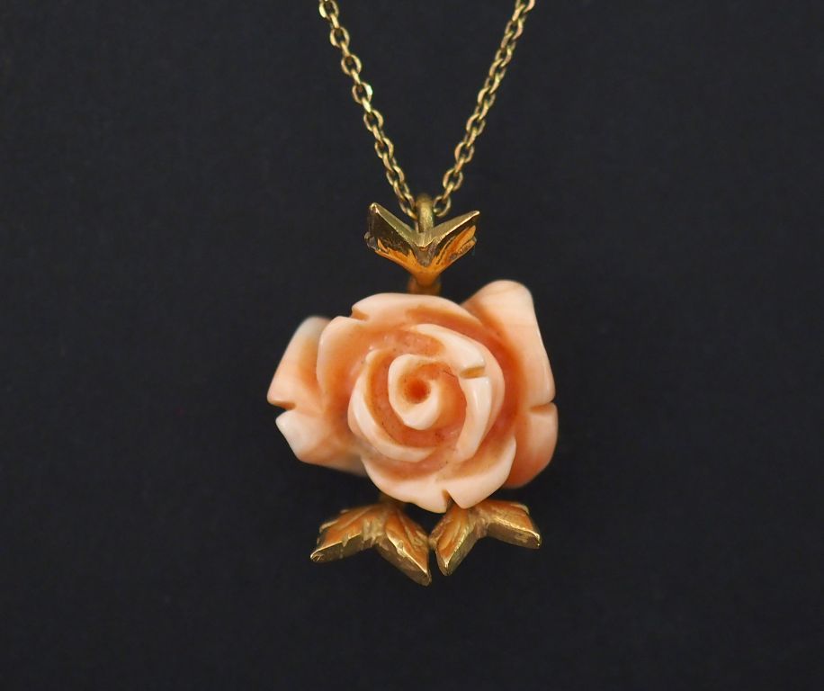 Chaine en or jaune, maille forçat, et son pendentif en or jaune et corail en forme de fleur épanouie. H. du pendentif : 2,2 cm Long. de la chaine : 38 cm Poids tel. 5,23 g