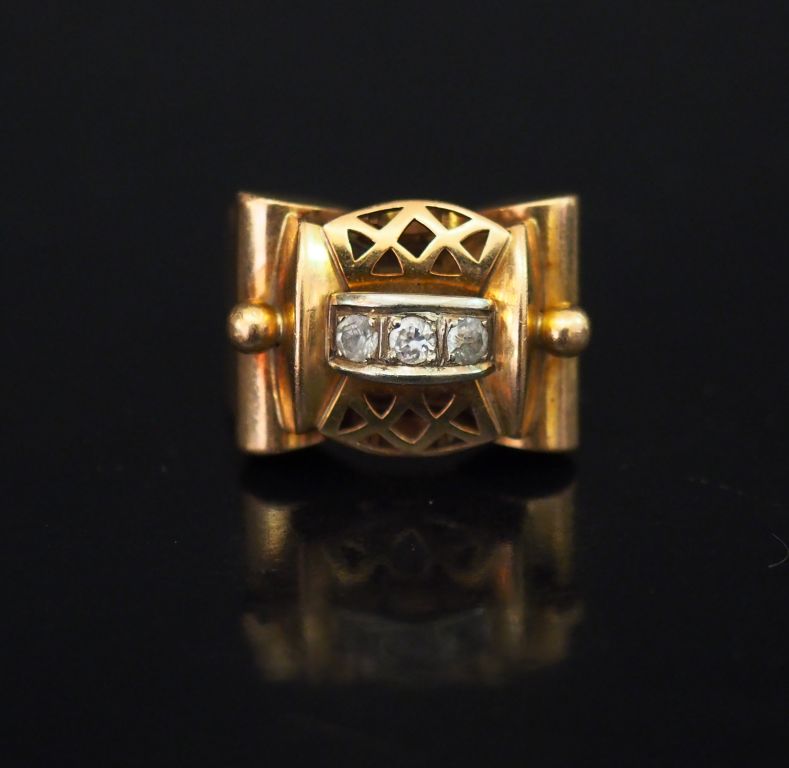 Chevalière en or 1940, partie supérieure de la monture ajourée et agrémentée de trois pierres à l'imitation du diamant. TDD. 47 Poids tel : 10,30 g