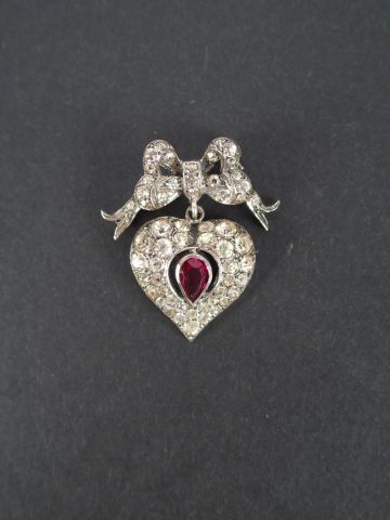 CHRISTIAN DIOR. Broche monture argent en forme de cœur enrubanné pavée de pierres à l'imitation du diamant et du rubis. Poids tel: 7gr