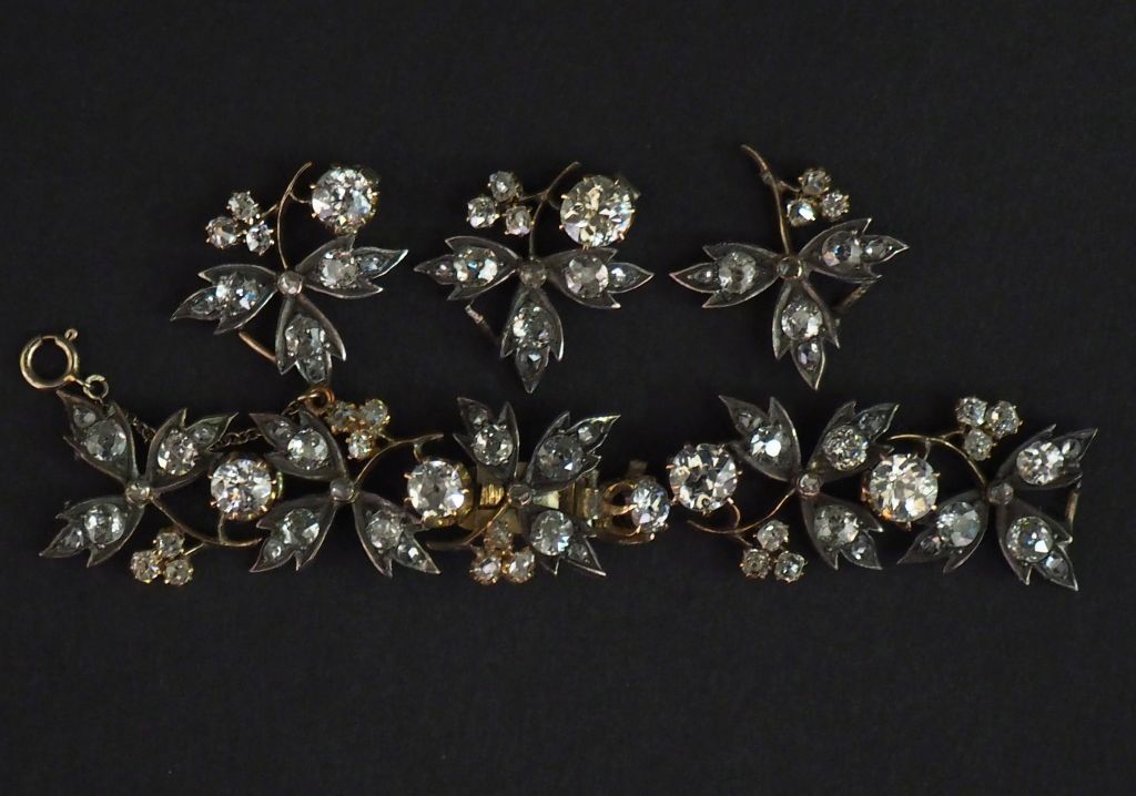 Cinq éléments de bracelet en argent et vermeil, sertis de diamants taille ancienne et taillés en rose, formant un motif de feuillage. Poids des diamants les plus gros variant entre 0,2 et 0,4 ct environ. Long. 12 cm Poids tel. 13,55 g